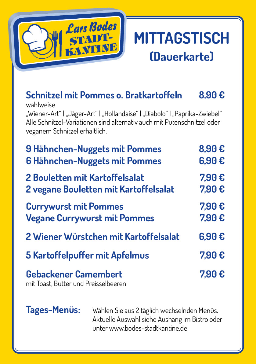 Telefon: 0151 - 295 180 87   |   E-Mail: info@bodes-stadtkantine.de   |   Geöffnet: Montag - Freitag von 6:30 - 15:00 Uhr